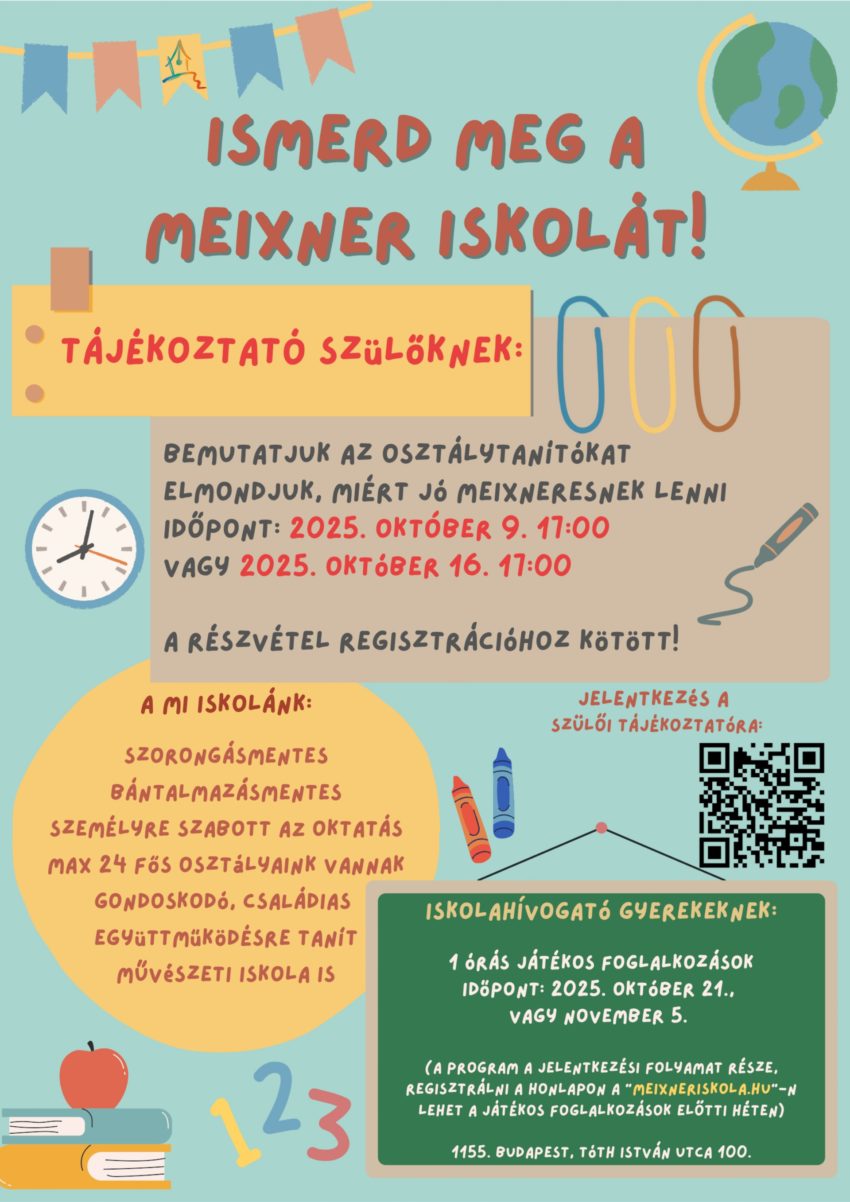 Az alábbi űrlap kitöltésével tudnak regisztrálni a szülői tájékoztató beszélgetésre 2025 október 9-re vagy október 16-ra. A 17.00-18.30-ig tartó alkalmon lehetőség lesz megismerkedni a leendő elsős tanítóinkkal, a fenntartóval és az iskola vezetőségével, a Meixner Iskola működésével, sajátosságaival. A tájékoztatók után nyílik meg a regisztrációs felület az október 21-i és a november 6-i délutáni Iskolahívogatóra, ahol már a gyerekeket várjuk különböző foglalkozásokra.